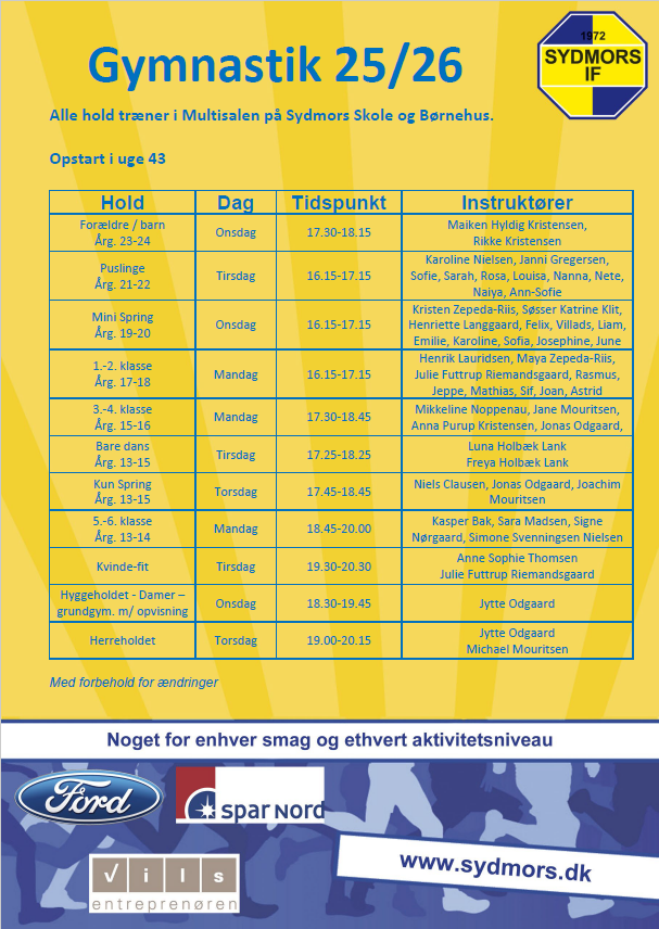 Sydmors IF tilbyder gymnastik for alle aldre. Vi starter vintersæsonen i uge 43, og tilstræber at have programmet klar. ca. 1.9.